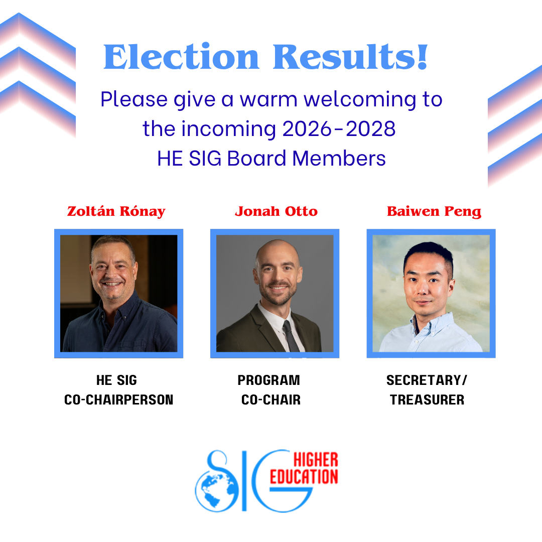 Thank you to everyone who participated in the CIES Higher Education SIG nomination and election processes. It is through your engagement and support that we are now able to proudly announce our incoming 2026-2028 HE SIG Board Members.
